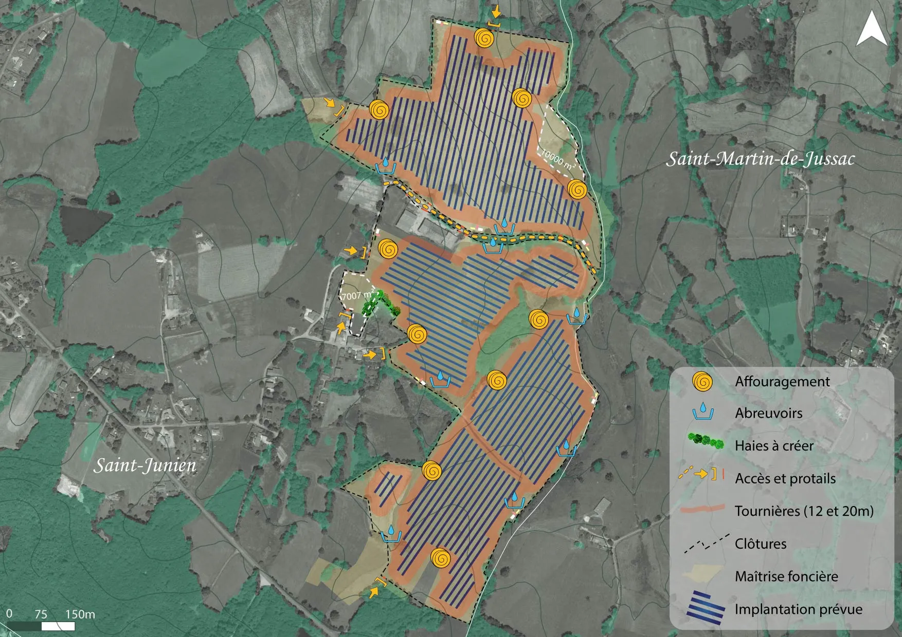 Le projet de la ferme agrisolaire du Bouchet vise à concilier agriculture et transition énergétique. Il favorise le bien-être animal grâce à des structures apportant ombrage et confort aux troupeaux. En réponse aux aléas climatiques, les installations photovoltaïques protègent les sols et sécurisent la production. Le projet permet aussi l’installation d’un jeune exploitant, assurant la continuité de l’activité agricole. Enfin, il valorise un capital foncier structuré, facilitant la reprise et renforçant la résilience de l’exploitation.
